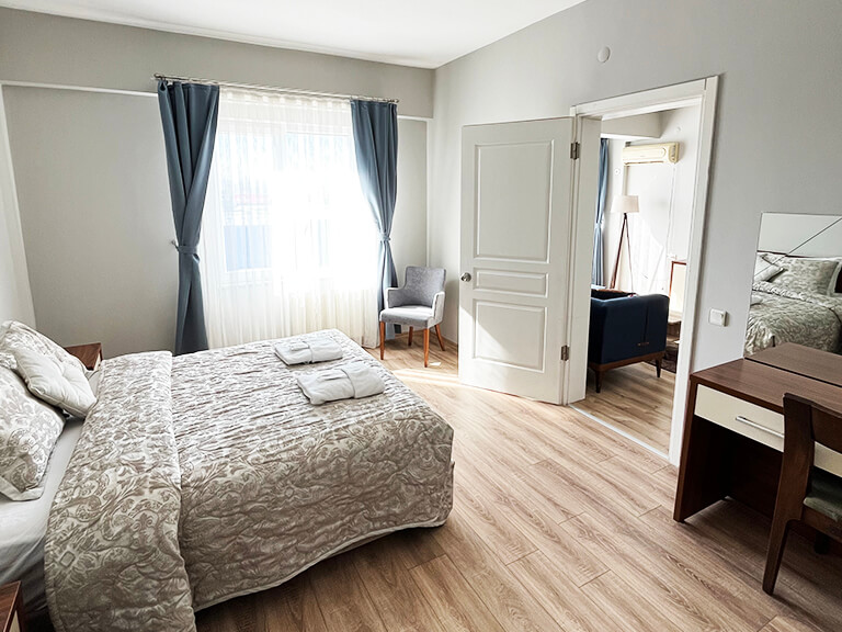 Suit odalarımız misafirlerimizin ihtiyaçlarını karşılayan konforda döşenmiş olup evinizde ki rahatlığı bulmanız amaçlanmıştır.